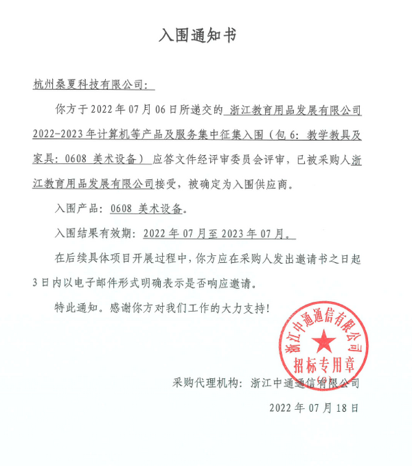 2022年7月18日,杭州桑夏科技有限公司喜獲“入圍通知書”。入圍項目是“浙江教育用品發展有限公司2022-2023年計算機等產品及服務集中征集入圍”中的美術設備。