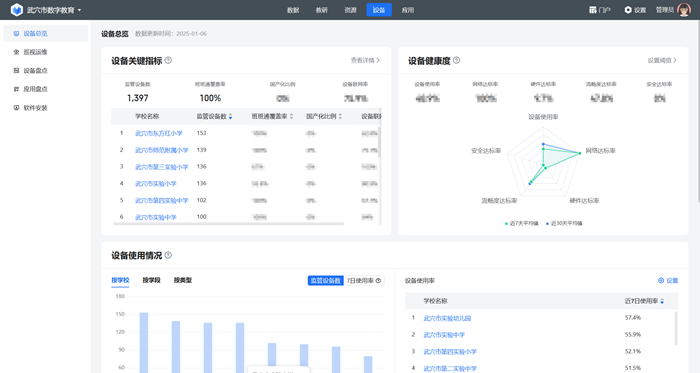 智能監(jiān)測(cè)下的資源優(yōu)化新格局:全市近1400臺(tái)班班通設(shè)備已無(wú)縫接入武穴市數(shù)字教育平臺(tái),由此開啟了設(shè)備管理的智能時(shí)代。平臺(tái)宛如學(xué)校設(shè)備的 “中樞神經(jīng)系統(tǒng)”,對(duì)全市學(xué)校設(shè)備數(shù)據(jù)進(jìn)行實(shí)時(shí)監(jiān)測(cè),每一臺(tái)設(shè)備的運(yùn)行狀況、使用頻率等信息都能精準(zhǔn)反饋。