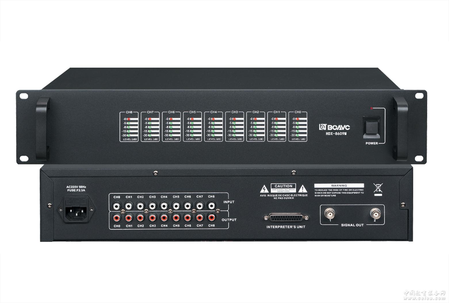 產品詳細介紹產品特點: ■★兼容IEC60914、GBT15381-94; ■★紅外線傳輸副載波符合IEC61603-7數(shù)字紅外國際標準; ■★采用DQPSK數(shù)字調制/解調技術; ■★具有9組LED電平信號指示; ■具有自動電平控制功能(ALC); ■紅外線傳輸技術,避免竊聽和無線電干擾,無電磁輻射; ■紅外線音頻處理技術,實現(xiàn)20Hz~20KHz超寬頻響; ■不受高頻驅動光源干擾,并有超強抗手機干擾能力; ■采用32 bit高速DSP處理,呈現(xiàn)完美音質; ■具有1路25針翻譯臺輸出口,可連接多臺翻譯臺; ■★具有2路紅外輻射板輸出BNC口,可連接多臺紅外輻射板; ■在同一建筑物內相鄰的會議室可安裝多套,且不會相互干擾; ■★具有9組音頻輸出,供會議音頻錄制使用; ■不受會場座位限制,在信號發(fā)射范圍內會議代表可任意走動; ■★具有1+8通道同聲傳譯,支持1+8種語言調制發(fā)射: 電 源: AC110~220V/50Hz/60Hz 靜態(tài)功率: 35W 晶振: 晶體控制 載波頻率: 1.7MHz~4MHz 偏差: ±6KHz(峰值±7KHz) 總諧波失真: <0.05% 通道隔離度: >80dB 動態(tài)范圍: >80dB 計權信噪比: >80dBA 信噪比(S/N): 80dB 頻率響應: 20-20KHz 輸入靈敏度: 500Mv-1.5V(線路電平) 射頻輸出阻抗: 50Ω 音頻輸入接口: RCA*9個 重量: 約6.5KG 機身尺寸: 483L×262W×90H(mm) 包裝尺寸: 560*410*170mm |