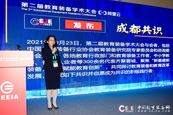 最后,在熱烈的氛圍中,由中國教育裝備行業(yè)協(xié)會副秘書長朱俊英現(xiàn)場宣讀發(fā)布了《第二屆教育裝備學(xué)術(shù)大會成都共識》。《共識》倡議在中國教育裝備行業(yè)協(xié)會的帶領(lǐng)下,全體會員單位和教育裝備研究機構(gòu)要深刻領(lǐng)會“教育新基建是信息化時代教育變革的牽引力量,是加快推進教育現(xiàn)代化、建設(shè)教育強國的戰(zhàn)略舉措”,依托教育新基建創(chuàng)新教育裝備,為構(gòu)建高質(zhì)量教育發(fā)展體系提供支撐和創(chuàng)新路徑。