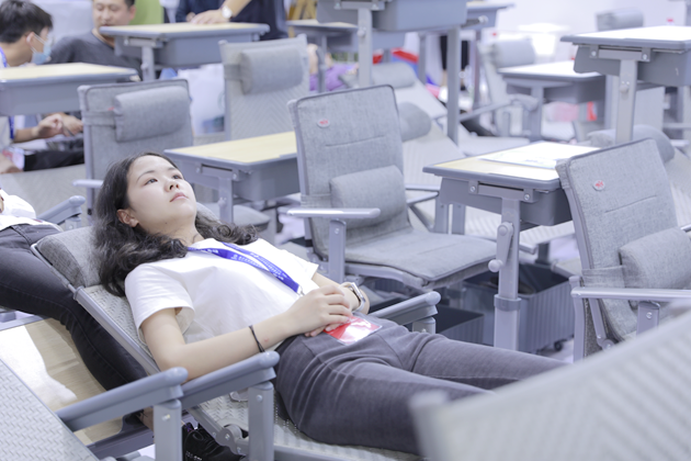 在研發(fā)時(shí)充分考慮到對(duì)教室空間的利用率,在課桌椅椅腳后部設(shè)計(jì)了獨(dú)有的穩(wěn)固腳,可實(shí)現(xiàn)前后桌椅穿插放置,達(dá)成不多占用教室空間的目的,并且讓平躺午休更加安全。在教室內(nèi)擺放時(shí),平均縱深長度不到一米,而且從座椅轉(zhuǎn)換成躺椅形態(tài)時(shí),也不需要向外擴(kuò)展空間,滿足多人教室和小面積教室的現(xiàn)實(shí)改造。