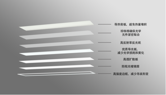 宜美照明優選7種材料,采用科學設計,從根源解決健康照明問題。在燈具底層,使用了導熱背板,可避免熱量堆積,減少安全隱患;背板上,珍珠棉能確保光學元件緊密貼合,防止光線漏出;然后是高反射率反光紙,可在增加光源利用率的同時,減少眩光的產生;在LED燈珠下,使用優質導光板,可減少光學損耗和黃化;在導光板下,還采用高透擴散板和防眩光棱鏡層,可有效減少眩光的形成;燈具外還采用高強度邊框,可減少吊裝變形,延長使用壽命。