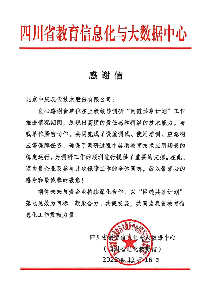 感謝信中指出,現(xiàn)代中慶“展現(xiàn)出高度的責(zé)任感和精湛的技術(shù)能力,為工作順利進行提供了重要的支撐。”此次四川省教育信息化與大數(shù)據(jù)中心的致謝,是對現(xiàn)代中慶技術(shù)實力與服務(wù)品質(zhì)的高度認(rèn)可。現(xiàn)代中慶將繼續(xù)秉持“技術(shù)服務(wù)教育”的理念,持續(xù)助力四川省教育數(shù)字化進程,為促進教育公平、提升教育質(zhì)量貢獻更多力量。