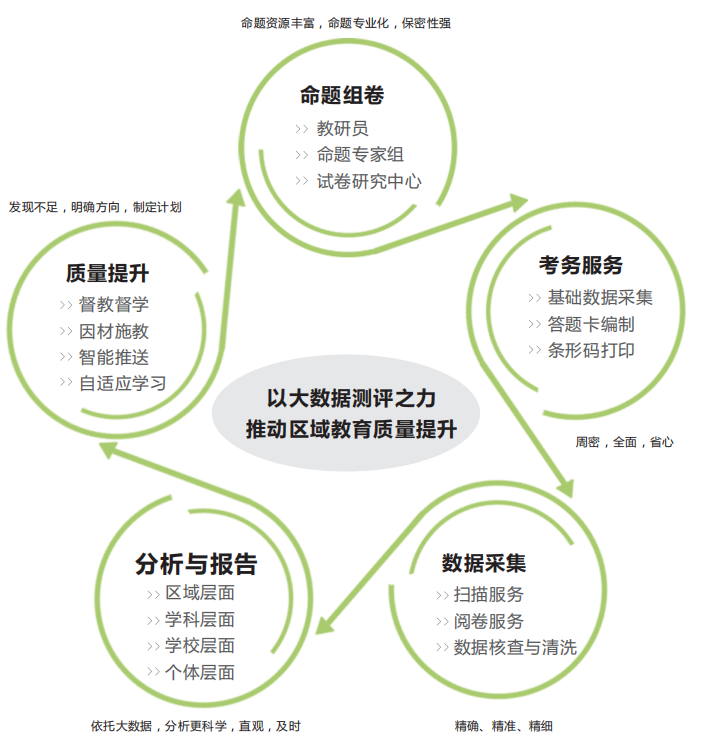 教育局 通過對區(qū)域考試數據進行全面采集,進而對數據進行深度挖掘與科學分析,最終自動生成適用于區(qū)域的不同層級、不同崗位用戶需求的個性化分析與診斷報告,并針對診斷結果智能推送相應的解決方案,以促進區(qū)域教育教學質量的全面提升,同時為區(qū)域教育改革與資源調整提供決策依據。